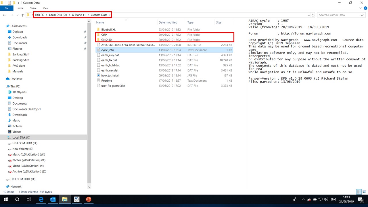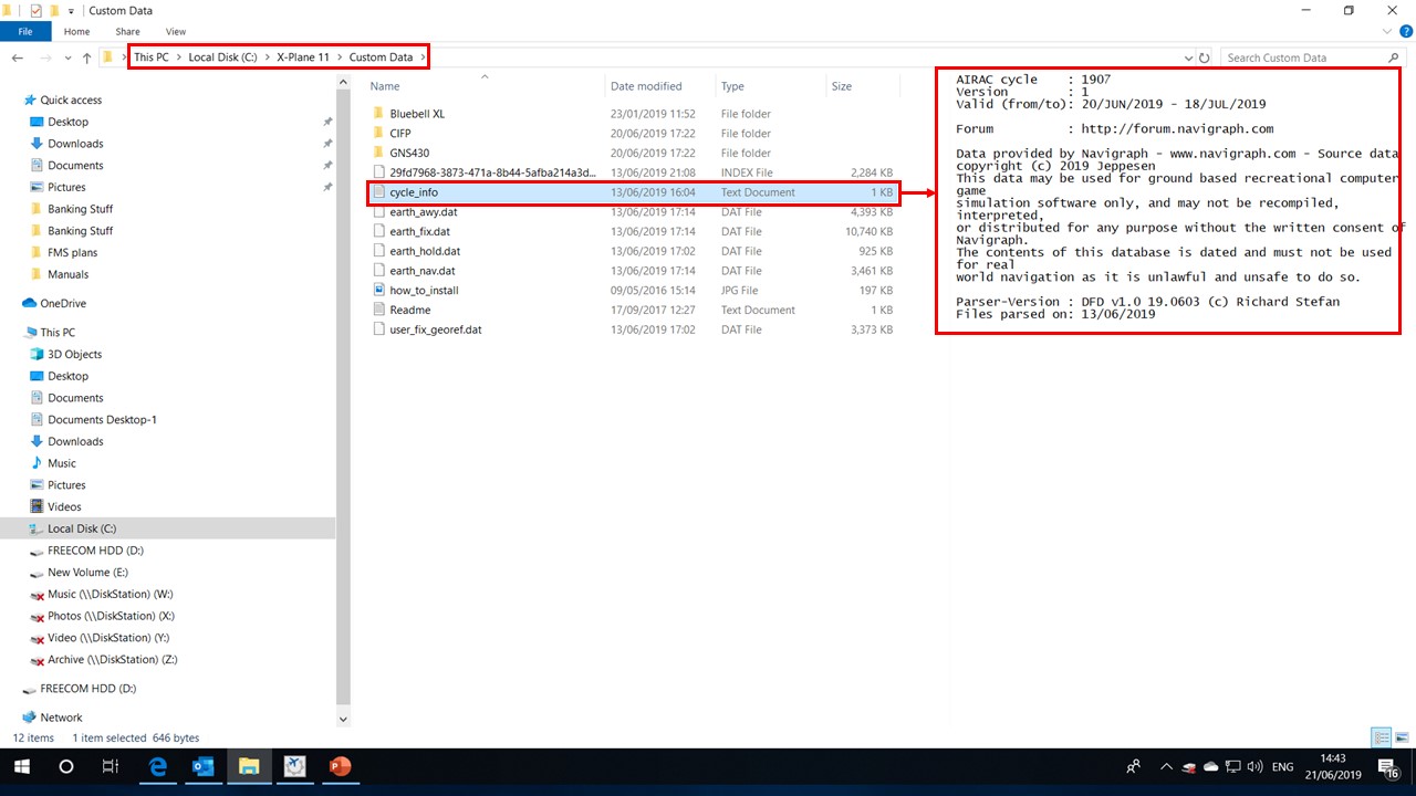 Finally, if you have set up everything correctly, you should then be able to go back into the C:\X-Plane 11\Custom Data folder to find the 'cycle_info.txt' file. If you click or open this text file, it will show you which Airac cycle you have installed? Mine is the latest one installed on 20th June 2019 with the 1907 cycle. Please see attached link:- http://questions.x-plane.com/?qa=blob&qa_blobid=17539973775118690744